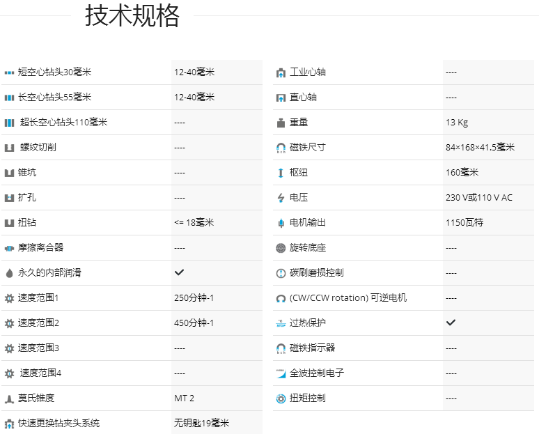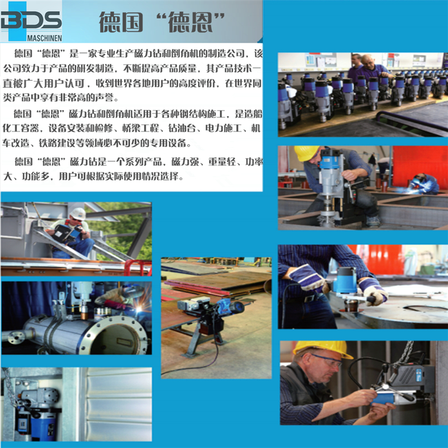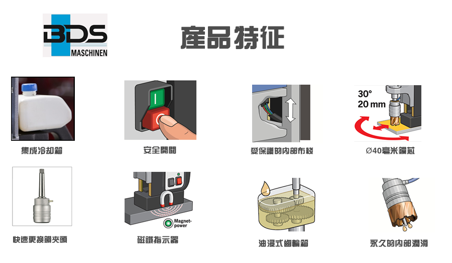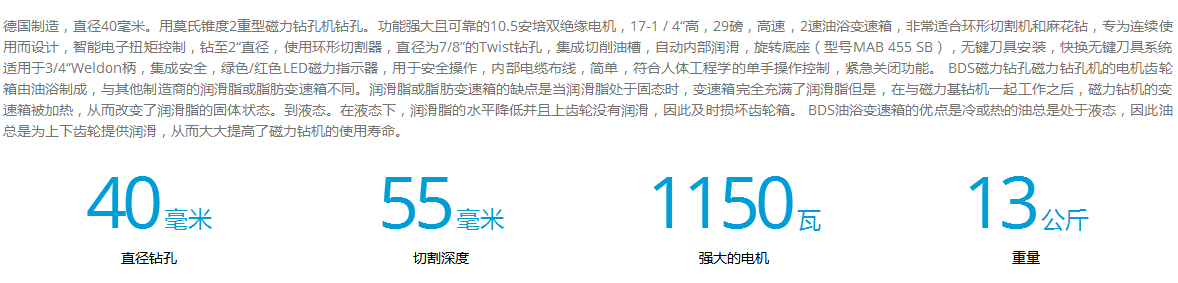 介紹:德國制造,直徑40毫米。用莫氏錐度2重型磁力鉆孔機鉆孔。功能強大且可靠的10.5安培雙絕緣電機,17-1 / 4“高,29磅,高速,2速油浴變速箱,非常適合環形切割機和麻花鉆,專為連續使用而設計,智能電子扭矩控制,鉆至2“直徑,使用環形切割器,直徑為7/8”的Twist鉆孔,集成切削油槽,自動內部潤滑,旋轉底座(型號MAB 455 SB),無鍵刀具安裝,快換無鍵刀具系統適用于3/4“Weldon柄,集成安全,綠色/紅色LED磁力指示器,用于安全操作,內部電纜布線,簡單,符合人體工程學的單手操作控制,緊急關閉功能。 BDS磁力鉆孔磁力鉆孔機的電機齒輪箱由油浴制成,與其他制造商的潤滑脂或脂肪變速箱不同。潤滑脂或脂肪變速箱的缺點是當潤滑脂處于固態時,變速箱完全充滿了潤滑脂但是,在與磁力基鉆機一起工作之后,磁力鉆機的變速箱被加熱,從而改變了潤滑脂的固體狀態。到液態。在液態下,潤滑脂的水平降低并且上齒輪沒有潤滑,因此及時損壞齒輪箱。 BDS油浴變速箱的優點是冷或熱的油總是處于液態,因此油總是為上下齒輪提供潤滑,從而大大提高了磁力鉆機的使用壽命。