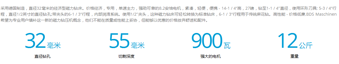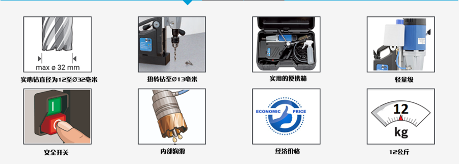 介紹:采用德國制造,直徑32毫米的經(jīng)濟(jì)型磁力鉆床。價格經(jīng)濟(jì),專用,單速主力,強(qiáng)勁可靠的8.2安培電機(jī),緊湊,輕便,便攜 - 14-1 / 4“高,27磅,鉆至1-1 / 4”直徑,使用環(huán)形刀具; 5-3 / 4“行程,直徑1/2英寸的直徑鉆孔;帶夾頭的6-1 / 3“行程,內(nèi)部潤滑系統(tǒng)。使用1/2”夾頭,這種磁力鉆床可輕松轉(zhuǎn)換為標(biāo)準(zhǔn)鉆床,6-1 / 3“行程用于傳統(tǒng)麻花鉆。高性能 - 價格低廉.BDS Maschinen希望為專業(yè)用戶填補(bǔ)這一新的磁力鉆壓機(jī)概念,他們不能在質(zhì)量或性能上妥協(xié),但能夠以優(yōu)惠的價格放棄舒適和配件。