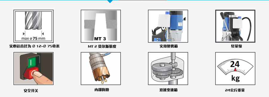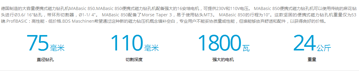 介紹:德國制造的大容量便攜式磁力鉆孔機MABasic 850.MABasic 850便攜式磁力鉆孔機配備強大的16安培電機,可提供230V和110V電壓。 MABasic 850便攜式磁力鉆孔機可以使用傳統(tǒng)的麻花鉆頭進行?3.6/ 16“鉆孔,帶環(huán)形切割器,?1-1/ 4”。 MABasic 850配備了Morse Taper 3,易于使用鉆頭MT3。 MABasic 850的行程為10“。這款堅固的便攜式磁力鉆孔機重量僅為53磅.ProfiBASIC:高性能 - 低價格.BDS Maschinen希望通過這種新的磁力鉆壓機概念填補空白,專業(yè)用戶不能妥協(xié)質(zhì)量或性能,但誰能夠放棄舒適和配件,以獲得良好的價格。