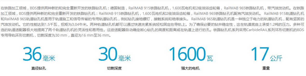 介紹:在鐵路加工領(lǐng)域,BDS提供兩種新的和完全重新開(kāi)發(fā)的鐵路鉆孔機(jī):德國(guó)制造,RailMAB 915鐵路鉆孔機(jī),1,600瓦電機(jī)和2級(jí)油浴齒輪箱,RailMAB 965鐵路鉆孔機(jī),帶汽油發(fā)動(dòng)機(jī)。在鐵路加工領(lǐng)域,BDS提供兩種新的和完全重新開(kāi)發(fā)的鐵路鉆孔機(jī):RailMAB 915鐵路鉆孔機(jī),1,600瓦電機(jī)和2級(jí)油浴齒輪箱,RailMAB 965鐵路鉆孔機(jī)配有汽油發(fā)動(dòng)機(jī)。 RailMAB 915軌道鉆孔機(jī)和RailMAB 965軌道鉆孔機(jī)是用于軌道施工和信號(hào)傳輸?shù)膶?zhuān)用軌道鉆孔機(jī),例如鉆孔接地螺釘,接觸系統(tǒng)和絕緣接頭。 RailMAB 965軌道鉆孔機(jī)是一種獨(dú)立于電力的軌道鉆孔機(jī),配有堅(jiān)固的汽油發(fā)動(dòng)機(jī)。它的性能達(dá)到1.5千瓦,扭矩為3.0??4牛米。兩種軌道鉆孔機(jī)都可以通過(guò)快速夾緊系統(tǒng)輕松固定在導(dǎo)軌上。為了確保必要的鉆井穩(wěn)定性,這在軌道底座上承受1.2噸的壓力。多種可選的軌道適配器極大地提高了兩個(gè)軌道鉆孔機(jī)的靈活性和易用性。這些適配器自動(dòng)確定巖心鉆孔的高度和距離或在軌道上進(jìn)行的孔。鐵路鉆孔機(jī)系列采用CarbideRAIL系列環(huán)形切割機(jī)的BDS專(zhuān)用導(dǎo)軌環(huán)形切割機(jī),切割深度為30 mm,直徑為16 mm至36 mm。